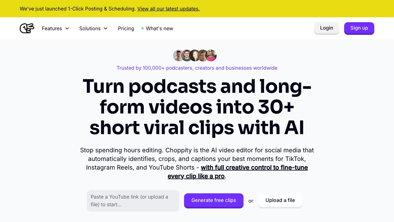 | Choppity | AI | $10/mo | Per-video | Face-tracking clips |