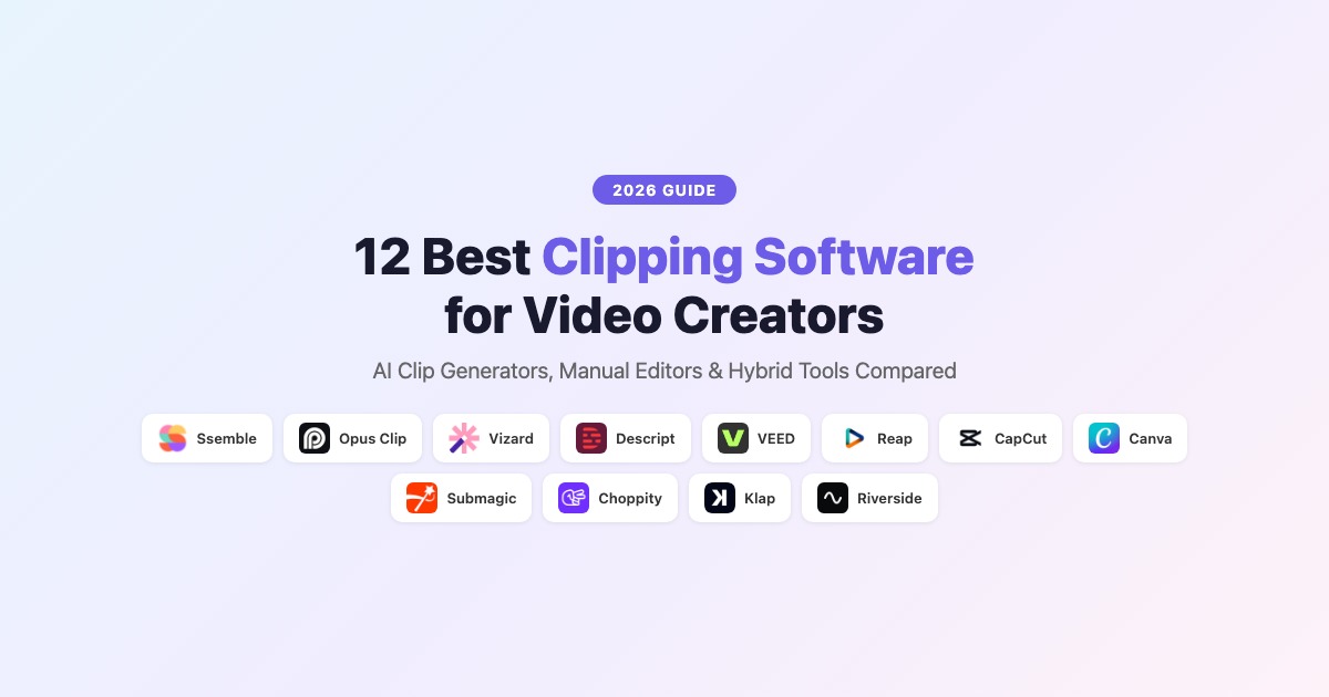 For most video creators, Ssemble is the best overall clipping software — it combines AI clip detection, B-roll, captions, sound effects, transitions, and scheduling at $7.50/mo. For free editing, CapCut is the best option. For teams, Vizard has the best collaboration features.