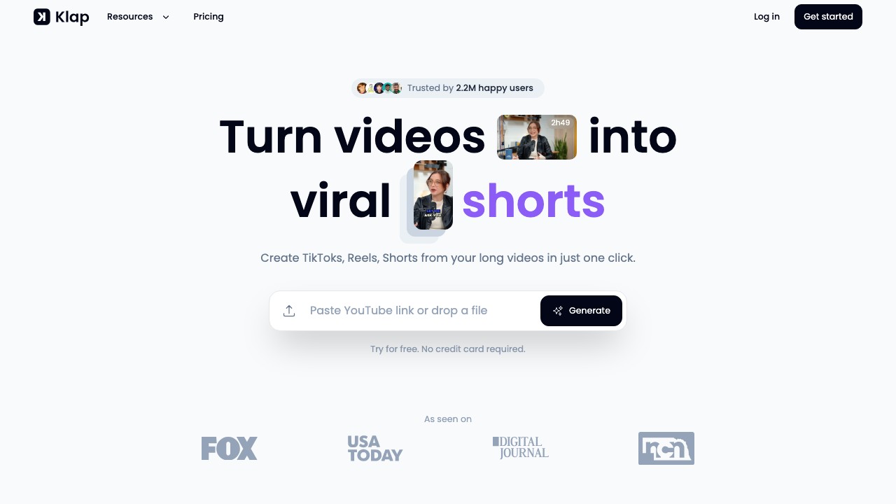 Klap delivers the simplest possible workflow: paste a YouTube URL, click generate, get clips. No complex settings, no learning curve.