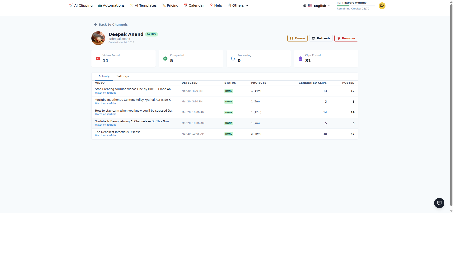 - View Activity Log — See every video that's been processed, how many clips were generated, virality scores, and posting results