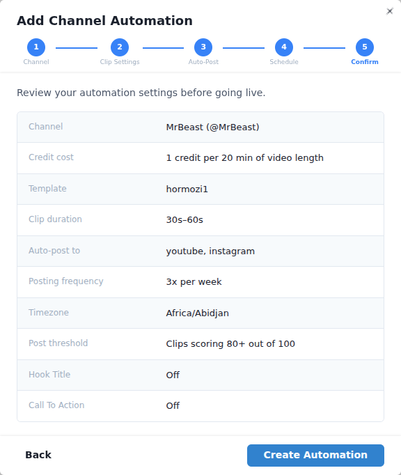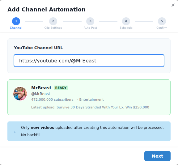 Channel Automation removes the most time-consuming part of short-form content: finding, clipping, editing, and posting. Set it up once, and every new video on your monitored channel becomes a stream of ready-to-post Shorts.