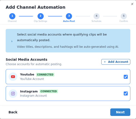 - Remove — Delete an automation entirely. Clips already generated are preserved; posts already published stay live.