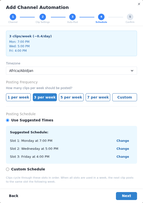 Channel Automation uses a weekly posting schedule with specific time slots. When a new clip is ready, it's automatically assigned to the next available slot.